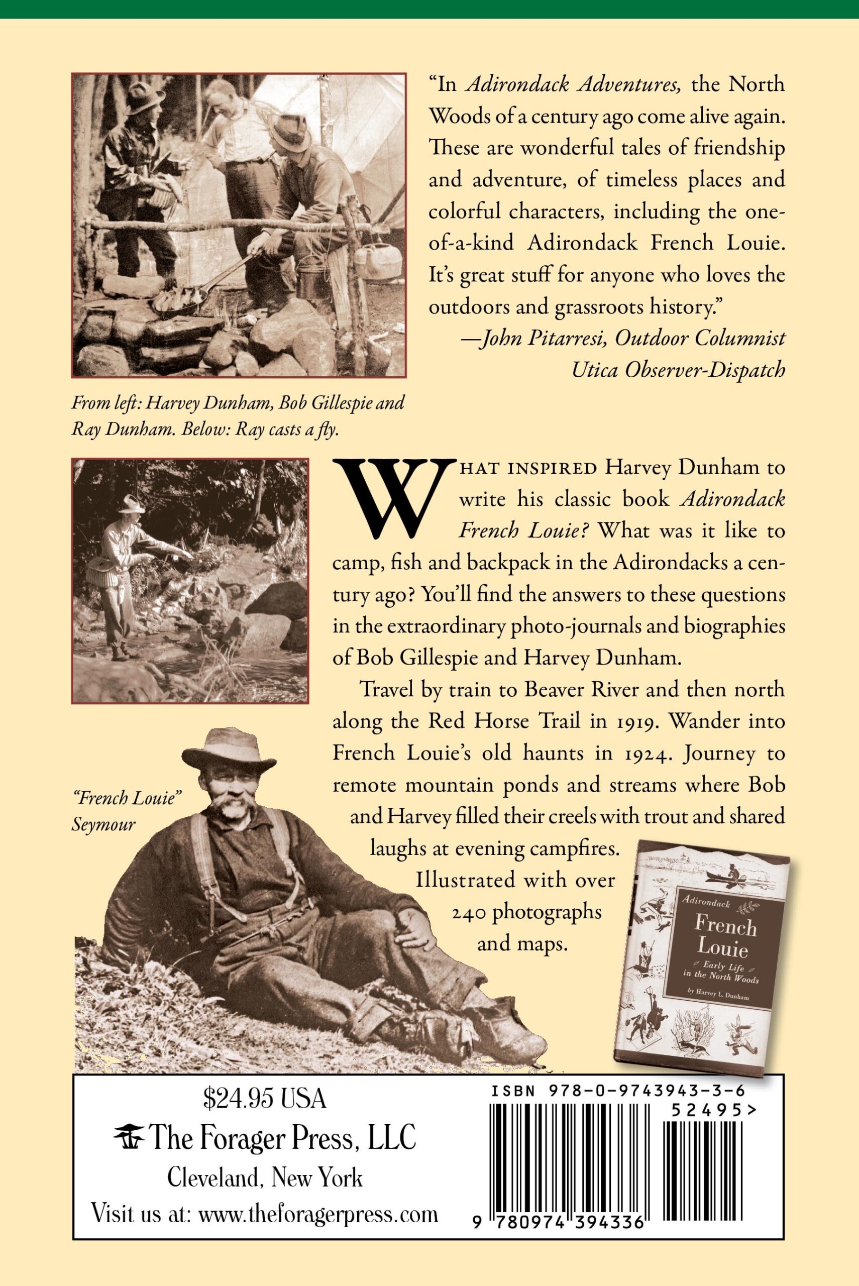 Developed around the extraordinary photo-journals of Harvey Dunham and Bob Gillespie, Adirondack Adventures details the camping adventures from 1895 to 1924, that inspired Dunham to write his classic book Adirondack French Louie. Outfitted in tall leather boots, felt caps, canvas tents and pack baskets they trek to remote mountain ponds, along the Beaver River and later into French Louie’s haunts along West Canada Creek, filling their creels with trout and sharing fireside stories along the way. Its part early 1900s travel guide, part biography, part history book, with over 240 photographs and maps. 100% pure Adirondack entertainment. A sure hit for the outdoorsman, fisherman or history buff.